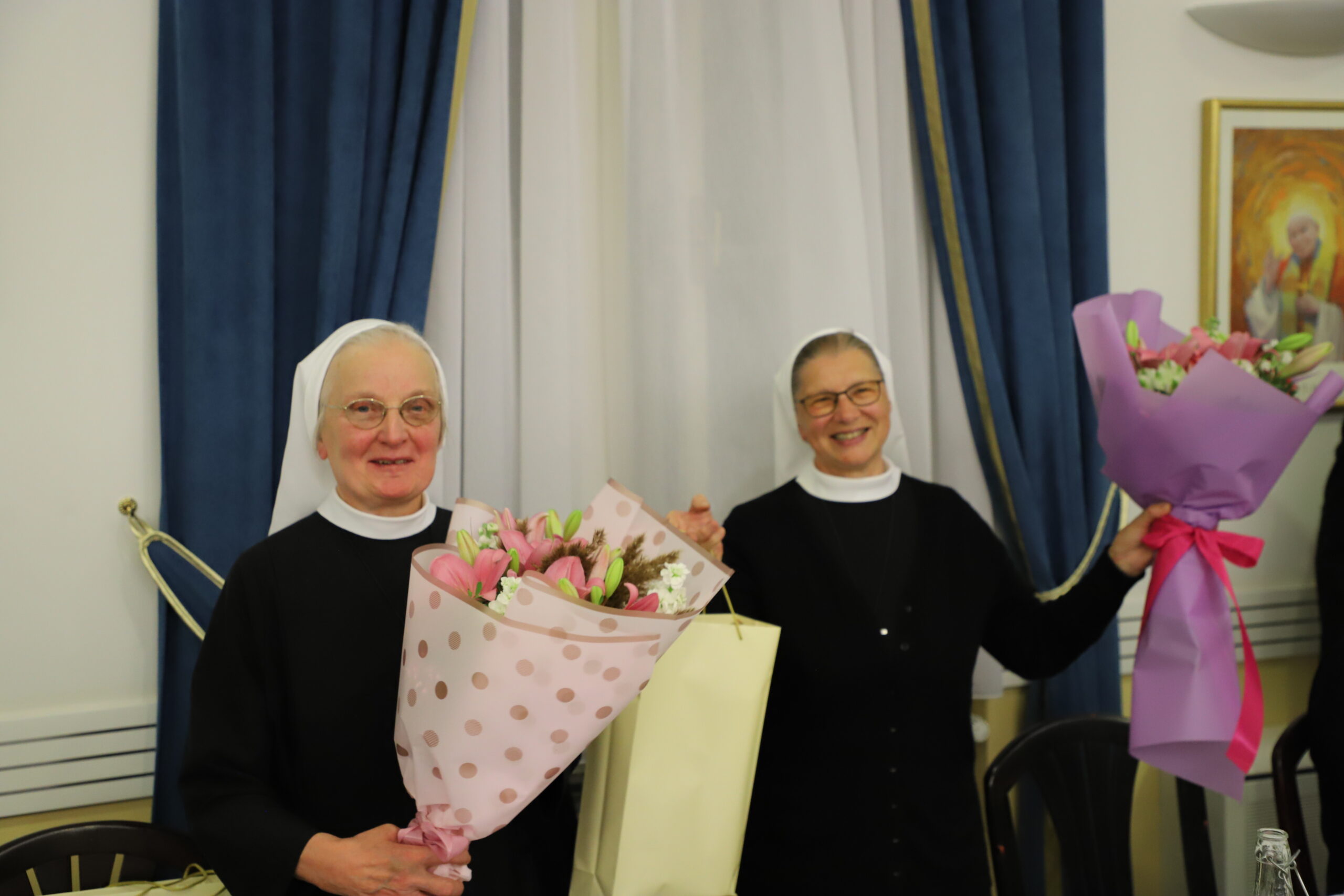 Nakon svete mise slavlje se nastavilo oko zajedničkog stola. Bogoslov Fabijan Križanović u ime bogoslova čestitao je i zahvalio sestrama na njihovoj prisutnosti, dok je bogoslov Ljudevit Marija Jaroš pozdravio vlč. Kolonića i zahvalio mu na dolasku i riječima ohrabrenja. Rektor Razum potom je još jednom zahvalio sestrama na svemu što čine za cijelu bogoslovnu zajednicu i zaželio im obilje Božjeg blagoslova u daljnjem redovničkom životu. Na kraju su se s nekoliko prigodnih riječi zahvalile i slavljenice – s. Štefanija i s. Božidara – a proslava je završila zajedničkim druženjem.