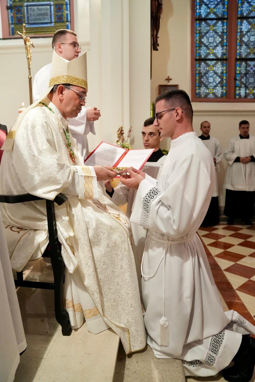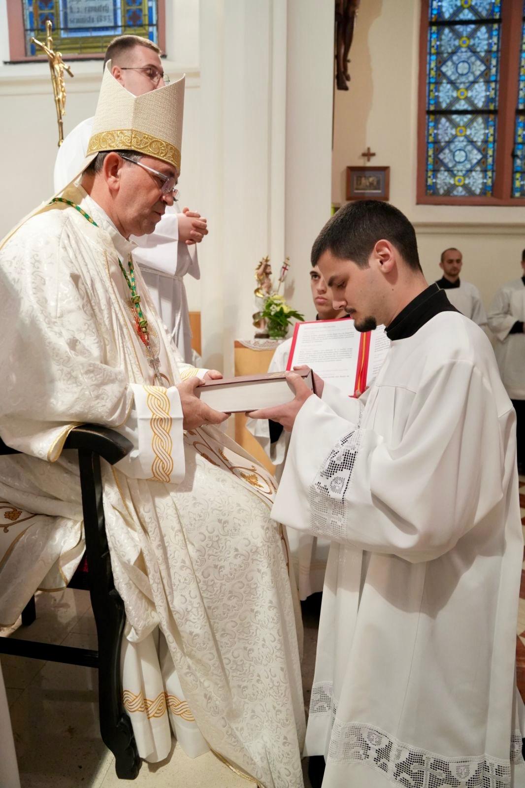 Govoreći potom o euharistiji i Božjem darivanju obratio se bogoslovima koji će biti postavljeni u službe lektorata i akolitata. „Služiti Isusu dok rastete i idete prema đakonatu i svećeništvu znači otvarati mu svoje srce kako bi njegova riječ, njegovo Tijelo i njegova Krv još više oblikovali vaš život, vašu duhovnost, vašu dušu“, rekao je biskup Martinović. Budućim lektorima, govoreći o Božjoj riječi, poručio je: „Dok je drugima budete čitali, prenosili i naviještali, budite svjesni da je najprije vama ta riječ upućena i darovana kao duhovna hrana za život u vjeri i nasljedovanju Sina Božjega i služenje njemu.“ Obratio se posebno i budućim akolitima i podsjetio ih: „Ne zaboravite milosti koje vam Gospodin daje jer postajete djelitelji i nositelji Tijela Kristova vjernicima, a posebno bolesnicima. Budući da je euharistija vrhunac smisla kršćanskog života i vjere, budite postojani u vjeri i rastite u njoj jer snagom euharistije pozvani ste biti svjedoci Božje ljubavi i nositelji nade.“ Nakon što je iznio ključne naglaske svake od službi koja se podjeljuje, biskup je nastavio: „Nemojte svoje službe shvatiti kao karijere, kao vlast, kao ono po čemu ćete biti ispred svojih kolega bogoslova ili veći od vjernika, nego kao poziv na poniznost i na još veću i dublju povezanost s Isusom Kristom od koga se svi trebamo učiti služenju Bogu, Crkvi, jedni drugima i svim ljudima.“ Svoju homiliju mons. Martinović zaključio je pozivom na iskrenost i poniznost u služenju Bogu, a bogoslovima je poželio da ih prati zagovor Nebeske Majke Marije i bl. Alojzija Stepinca.